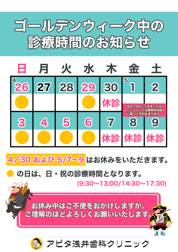 なお、5月8日(金)・9日(土)につきましては、【インプラント診療無料相談】に限りご予約を承ります。