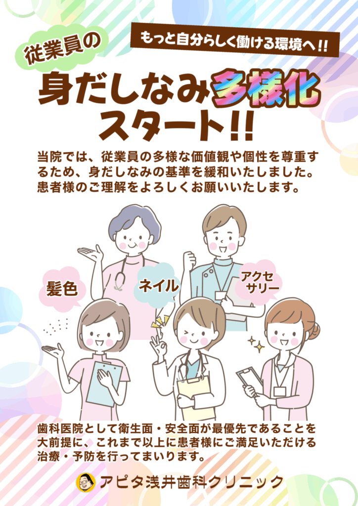 この度当院では、従業員の多様性や個性を尊重し、一人ひとりが自分らしくいきいきと働ける環境づくりの一環として身だしなみの基準を大幅に緩和いたしました。